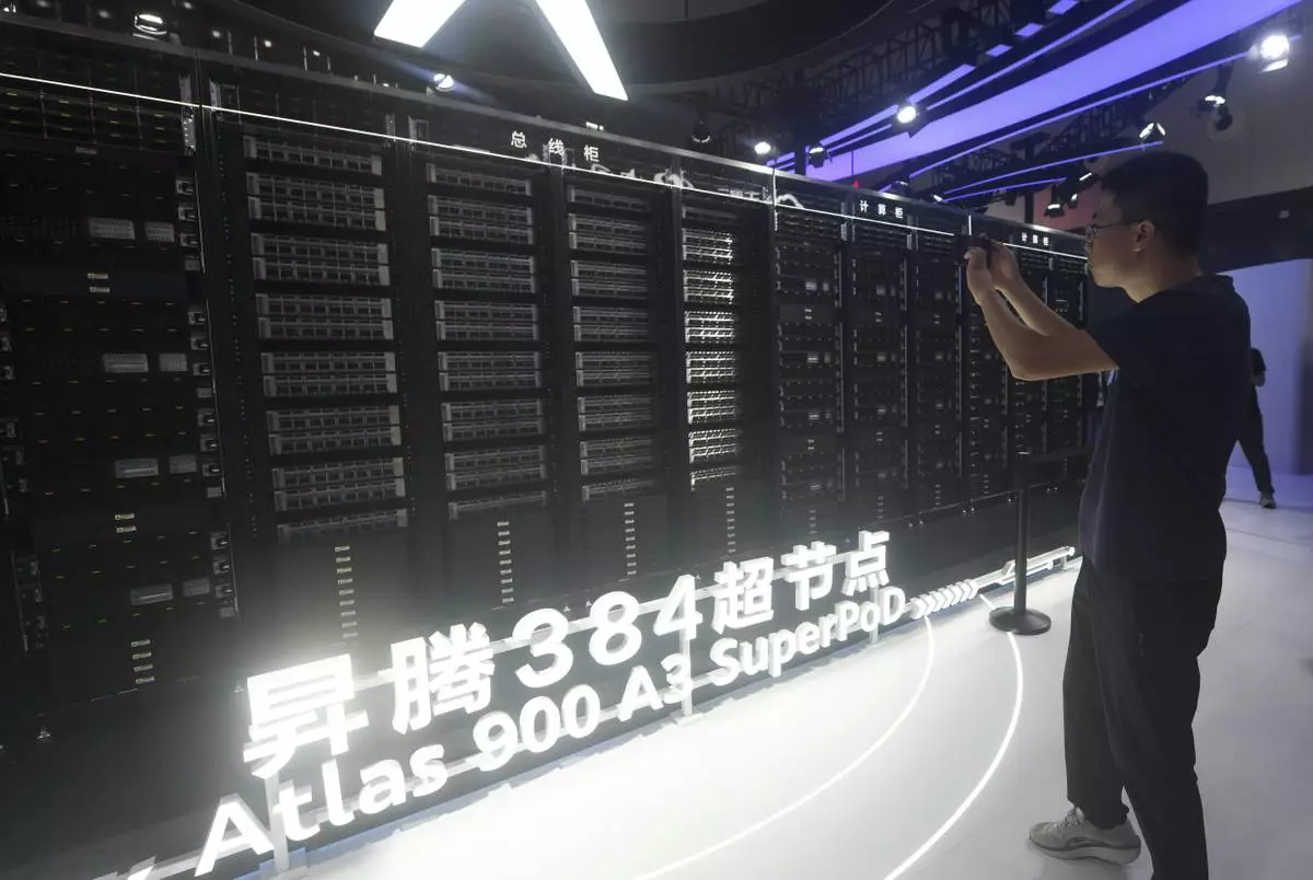 A visitor takes photos of the Huawei Atlas 900 A3 SuperPoD exhibited at the World Artificial Intelligence Conference in Shanghai, China, July 26, 2025. (Chinatopix Via AP) CHINA OUT