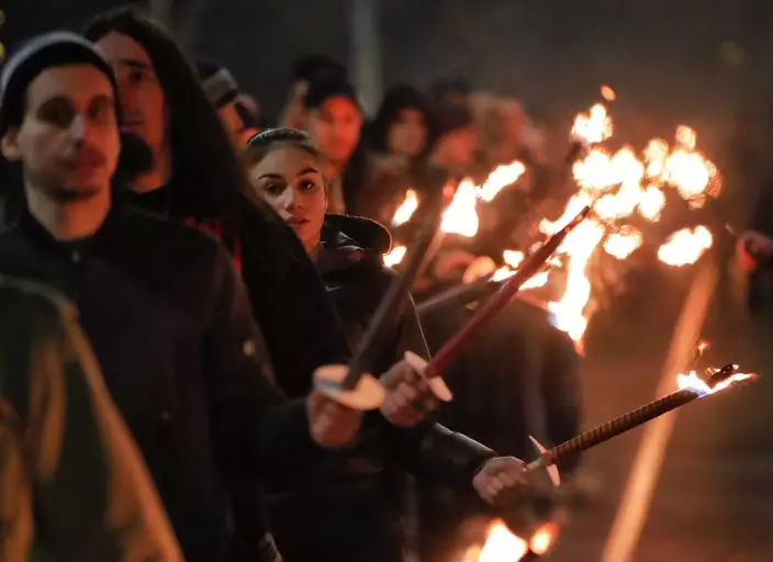 People walk holding torches as they take part in the "Lukov March," staged by the far-right Bulgarian National Union, in Sofia, Bulgaria, Saturday, Feb. 16, 2019. Bulgarian nationalists have marched through Sofia, the country's capital, to honor a World War II general known for his anti-Semitic and pro-Nazi activities. The annual Lukov March, staged by the far-right Bulgarian National Union, attracted hundreds of dark-clad supporters who walked through downtown Sofia holding torches and Bulgarian flags and chanting nationalist slogans. (AP PhotoVadim Ghirda)