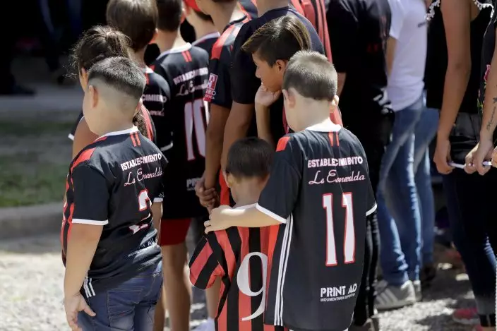 Children wait for soccer player Emiliano Sala's coffin to depart for Santa Fe, after his wake in Progreso, Argentina, Saturday, Feb. 16, 2019. The Argentina-born forward died in an airplane crash in the English Channel last month when flying from Nantes in France to start his new career with English Premier League club Cardiff. (AP PhotoNatacha Pisarenko)