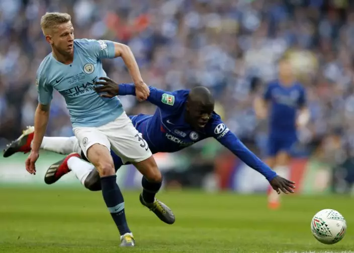 Manchester City's Oleksandr Zinchenko, left, challenges Chelsea's N'Golo Kantech, right, during the English League Cup final soccer match between Chelsea and Manchester City at Wembley stadium in London, England, Sunday, Feb. 24, 2019. (AP PhotoAlastair Grant)