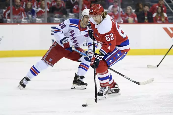 Washington Capitals left wing Carl Hagelin (62), of Sweden, skates with the puck against New York Rangers left wing Chris Kreider (20) during the second period of an NHL hockey game, Sunday, Feb. 24, 2019, in Washington. (AP PhotoNick Wass)