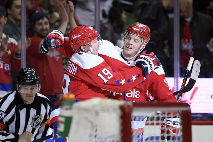 Washington Capitals center Nicklas Backstrom (19), of Sweden, celebrates his goal with defenseman John Carlson, right, during the first period of an NHL hockey game against the New York Rangers, Sunday, Feb. 24, 2019, in Washington. (AP PhotoNick Wass)