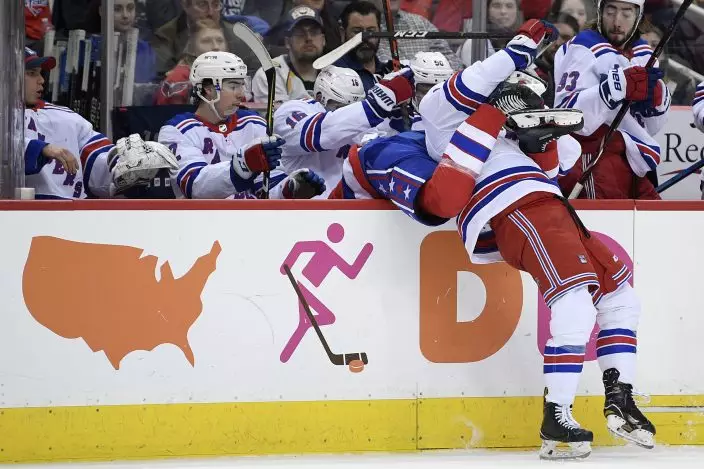 Washington Capitals right wing Brett Connolly (10), center, falls into the New York Rangers bench with the help of Rangers left wing Connor Brickley, front right, during the second period of an NHL hockey game, Sunday, Feb. 24, 2019, in Washington. (AP PhotoNick Wass)