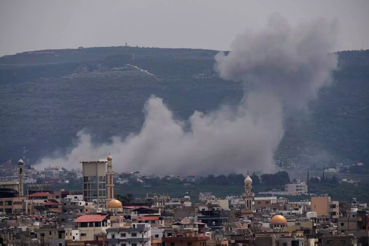 Smoke rises following an Israeli airstrike on the village of Qlaileh, as seen from the southern port city of Tyre, Lebanon, Wednesday, April 15, 2026. (AP Photo/Hussein Malla)