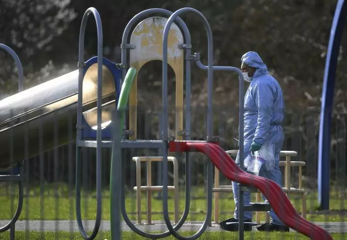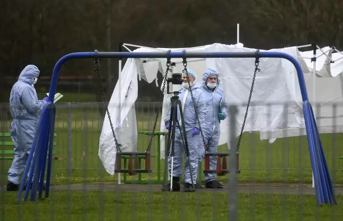 Police forensic officers at the scene in east London, Saturday March 2, 2019, following the fatal stabbing of a 17-year-old girl on Friday night. Two 17-year-olds were stabbed to death last weekend in different parts of England, plunging families into grief and igniting an intense debate, published in Britain's news media Tuesday March 5, 2019, about why so many young people are dying, and who is to blame.(Victoria JonesPA via AP)