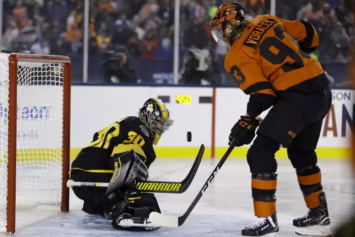 Pittsburgh Penguins' Matt Murray, left, blocks a shot as Philadelphia Flyers' Jakub Voracek looks for the rebound during the third period of an NHL Stadium Series hockey game at Lincoln Financial Field, Saturday, Feb. 23, 2019, in Philadelphia. Philadelphia won 4-3 in overtime. (AP PhotoMatt Slocum)