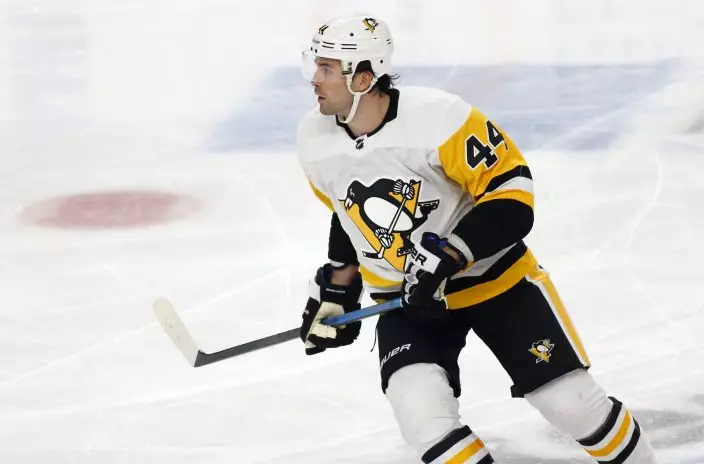 Pittsburgh Penguins defenseman Erik Gudbranson (44) skates during the first period of an NHL hockey game against the Buffalo Sabres, Friday, March. 1, 2019, in Buffalo N.Y. (AP PhotoJeffrey T. Barnes)