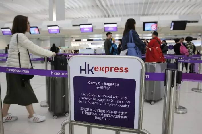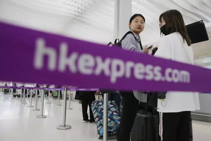 In this March 26, 2019 photo, passengers wait at the check-in counter of Hong Kong Express Airways at the Hong Kong International Airport. Cathay Pacific Airways is acquiring Hong Kong-based budget airline HK Express. Cathay said Wednesday, March 27, 2019, it will pay 4.93 billion Hong Kong dollars ($628 million) for HK Express. It said the acquisition will retain its identity as a separate brand and be operated as a low-cost carrier. (AP PhotoKin Cheung)