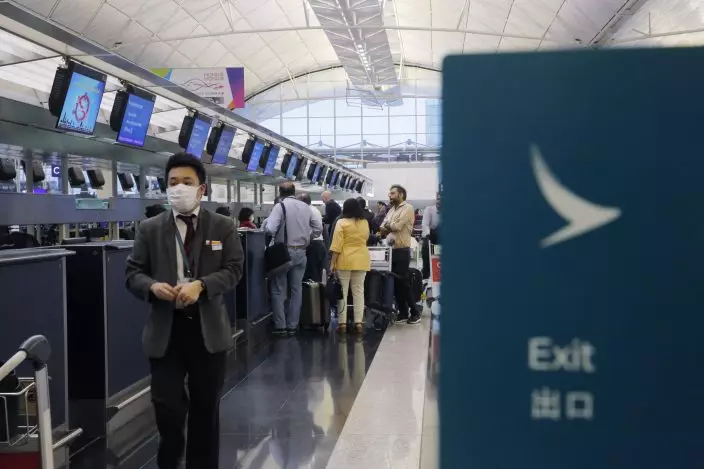 In this March 26, 2019 photo, passengers wait at the check-in counter of Cathay Pacific Airways at the Hong Kong International Airport. Cathay Pacific Airways is acquiring Hong Kong-based budget airline HK Express. Cathay said Wednesday, March 27, 2019, it will pay 4.93 billion Hong Kong dollars ($628 million) for HK Express. It said the acquisition will retain its identity as a separate brand and be operated as a low-cost carrier. (AP PhotoKin Cheung)