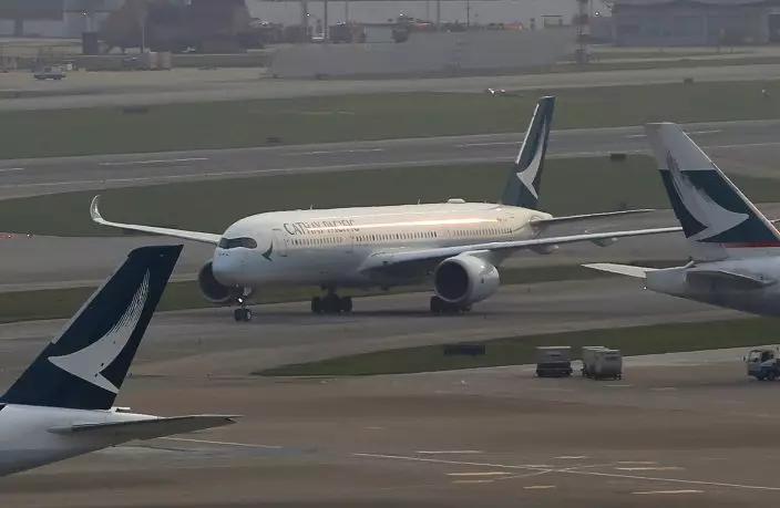In this March 26, 2019 photo, a Cathay Pacific Airways passenger aircraft lands at the Hong Kong International Airport. Cathay Pacific Airways is acquiring Hong Kong-based budget airline HK Express. Cathay said Wednesday, March 27, 2019, it will pay 4.93 billion Hong Kong dollars ($628 million) for HK Express. It said the acquisition will retain its identity as a separate brand and be operated as a low-cost carrier. (AP PhotoKin Cheung)