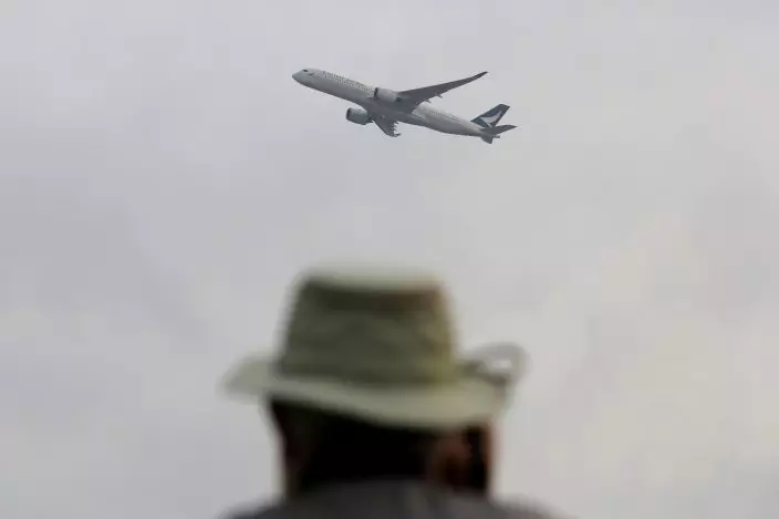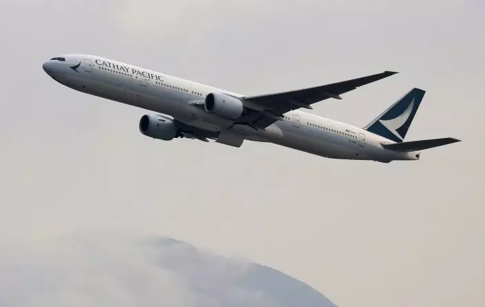 In this March 26, 2019 photo, a Cathay Pacific Airways passenger aircraft takes off from the Hong Kong International Airport. Cathay Pacific Airways is acquiring Hong Kong-based budget airline HK Express. Cathay said Wednesday, March 27, 2019, it will pay 4.93 billion Hong Kong dollars ($628 million) for HK Express. It said the acquisition will retain its identity as a separate brand and be operated as a low-cost carrier. (AP PhotoKin Cheung)