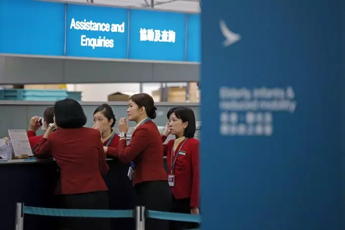 In this March 26, 2019 photo, staff members chat at the check-in counter of Cathay Pacific Airways at the Hong Kong International Airport. Cathay Pacific Airways is acquiring Hong Kong-based budget airline HK Express. Cathay said Wednesday, March 27, 2019, it will pay 4.93 billion Hong Kong dollars ($628 million) for HK Express. It said the acquisition will retain its identity as a separate brand and be operated as a low-cost carrier. (AP PhotoKin Cheung)