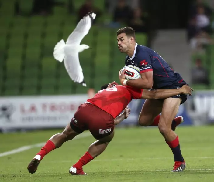 Tom English of the Rebels, right, is tackled by Ryohei Yamanaka of the Sunwolves during their Super Rugby match in Melbourne, Australia, Saturday, April 6, 2019. (Hamish BlairAAP Image via AP)