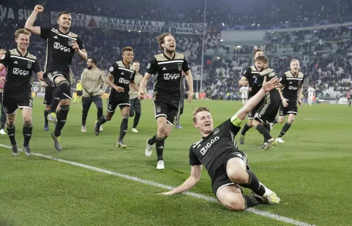 Ajax's Matthijs de Ligt and teammates celebrate at the end of the Champions League, quarterfinal, second leg soccer match between Juventus and Ajax, at the Allianz stadium in Turin, Italy, Tuesday, April 16, 2019. Ajax won 2-1 and advances to the semifinal on a 3-2 aggregate. (AP PhotoLuca Bruno)