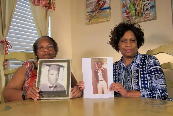 In this Wednesday, April 10, 2019, photo Mylinda Byrd Washington, 66, left, and Louvon Byrd Harris, 61, hold up photographs of their brother James Byrd Jr. in Houston. James Byrd Jr. was the victim of what is considered to be one of the most gruesome hate crime murders in recent Texas history. (AP PhotoJuan Lozano)