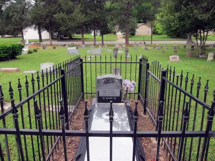 This April 12, 2019, photo shows the gravesite of James Byrd Jr. in Jasper, Texas. Byrd was killed on June 7, 1998, after he was chained to the back of a pickup truck and dragged for nearly three miles along a secluded road in the piney woods outside Jasper in what is considered one of the most gruesome hate crime murders in recent Texas history. (AP PhotoJuan Lozano)