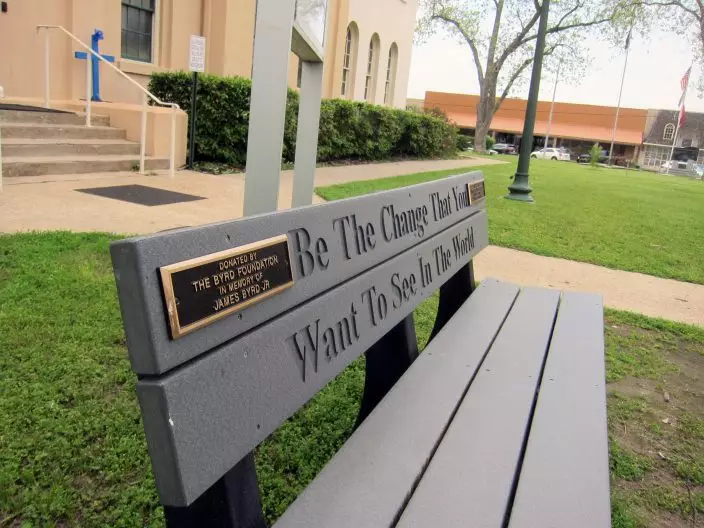 This April 12, 2019, photo shows a bench donated by a foundation started by the family of James Byrd Jr. in Jasper, Texas. The bench is located in front of the county courthouse in Jasper, Texas, where two of the three men convicted for Byrd's death, considered one of the most gruesome hate crime murders in recent Texas history, were tried. John William King, the convicted ringleader of Byrd's death, is set to be executed on Wednesday, April. 24, 2019. (AP PhotoJuan Lozano)