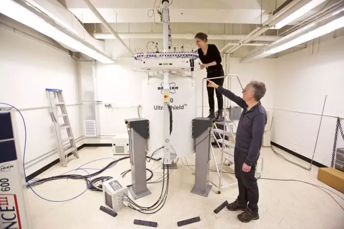 Graduate student Anna Duell, top, and Dr. David Peyton collect samples from a nuclear magnetic resonance spectrometer in a lab at Portland State University in Portland, Ore., Tuesday, April 16, 2019. Peyton co-authored a study analyzing the concentration of Juul’s full-strength pod against nine other nicotine formulas on the market in 2017. Juul’s nicotine level dwarfed its competitors, in some cases by twentyfold. (AP PhotoCraig Mitchelldyer)
