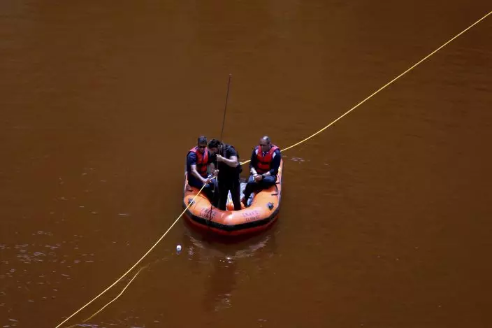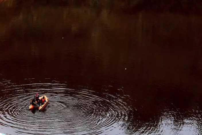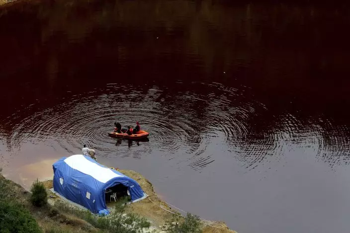 Members of the Cyprus Special Disaster Response Unit are seen in boat as they search for suitcases in a man-made lake, near the village of Mitsero outside of the capital Nicosia, Cyprus, Tuesday, April 30, 2019. Cyprus police spokesman Andreas Angelides says British experts called in to assist in the east Mediterranean island nation's serial killer case have been brought up to speed on the ongoing probe. (AP PhotoPetros Karadjias)
