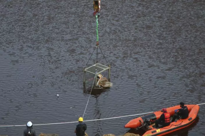 A diver is lowered into a man-made lake to search for suitcases containing the bodies of three victims, near the village of Mitsero outside of the capital Nicosia, Cyprus, Thursday, May 2, 2019. The justice minister in Cyprus resigned amid mounting criticism that police bungled their investigations when some of the seven foreign women and girls slain by a serial killer were initially reported missing. (AP PhotoPetros Karadjias)