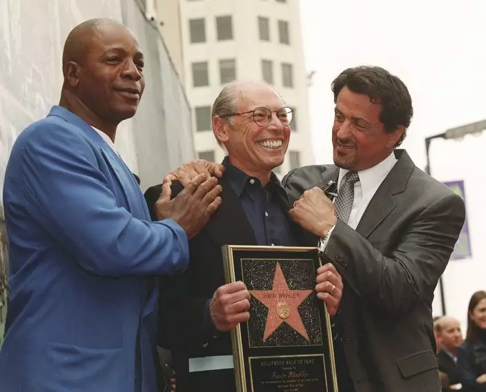 FILE – In this April 28, 2000, file photo, actor and screenwriter Sylvester Stallone, right, and his "Rocky" co-star Carl Weathers, left, pose with producer Irwin Winkler at a ceremony honoring Winkler with a star on the Hollywood Walk of Fame in Los Angeles. Winkler released a new memoir, "A Life in Movies: Stories from 50 years in Hollywood." (AP PhotoChris Pizzello, File)
