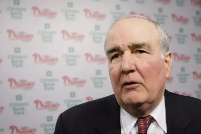 FILE - In this Oct. 30, 2008, file photo, Philadelphia Phillies' David Montgomery is seen after a news conference in Philadelphia. The Phillies say the team's chairman has passed away after a lengthy battle with cancer. David Montgomery was 72. The MLB team announced his death Wednesday, May 8, 2019. Montgomery's Phillies career began in 1971, working in the ticket office during the day and helping operate the scoreboard at night. (AP PhotoMatt Rourke, File)