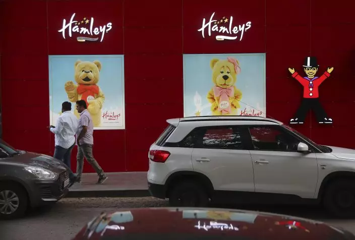 Shoppers walk past a Hamleys store in New Delhi, India, Friday, May 10, 2019. India's Reliance Retail, a subsidiary of Reliance Industries Limited, announced Thursday that it has signed agreements to acquire the 259-year-old British toy store chain Hamleys. (AP PhotoManish Swarup)
