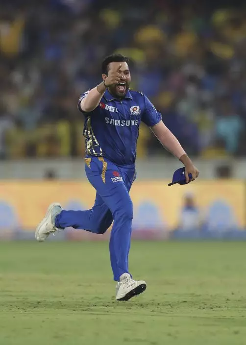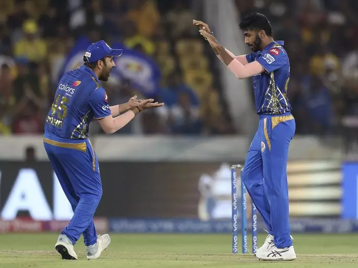 Mumbai Indians Jasprit Bumrah, right, celebrates with captain Rohit Sharma after the dismissal of Chennai Super King's Ambati Rayudu during the VIVO IPL T20 cricket final match in Hyderabad, India, Sunday, May 12, 2019. (AP Photo Mahesh Kumar A.)
