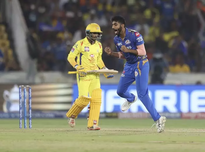 Mumbai Indians Jasprit Bumrah, right, celebrates the dismissal of Chennai Super King's Ambati Rayudu, left, during the VIVO IPL T20 cricket final match in Hyderabad, India, Sunday, May 12, 2019. (AP Photo Mahesh Kumar A.)
