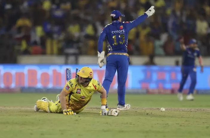Chennai Super King's Shane Watson, left, falls on the ground after being run-out during the VIVO IPL T20 cricket final match between Mumbai Indians and Chennai Super Kings in Hyderabad, India, Sunday, May 12, 2019. (AP Photo Mahesh Kumar A.)