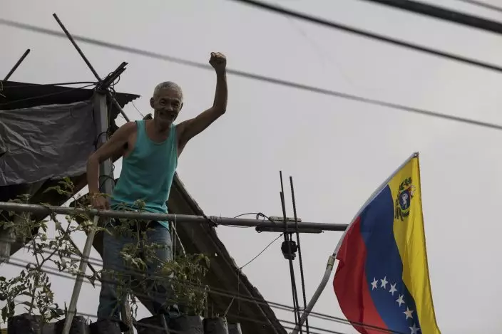 A man holds up his fist to show support for the government of President Nicolas Maduro, from his balcony which overlooks a public square where residents socialize and dance in Caracas, Venezuela, at sunset Saturday, May 11, 2019. (AP PhotoRodrigo Abd)