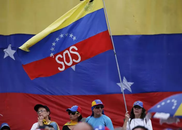 A supporter of Venezuela's opposition leader and self-proclaimed interim president Juan Guaidó, waves a Venezuelan flag marked with the letters "SOS", during a rally in Caracas, Venezuela, Saturday, May 11, 2019. Guaidó has called for nationwide marches protesting the Maduro government, demanding new elections and the release of jailed opposition lawmakers. (AP PhotoFernando Llano)