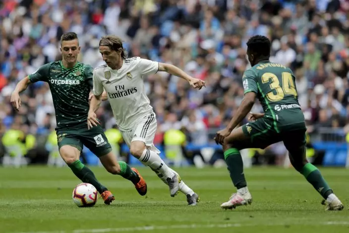 Real Madrid's Luka Modric, center, duels for the ball against Betis player Lo Celso, left and Betis player Kaptoum during a Spanish La Liga soccer match at the Santiago Bernabeu stadium in Madrid, Spain, Sunday, May 19, 2019. (AP PhotoBernat Armangue)