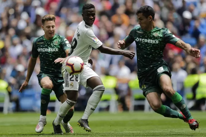 Real Madrid's Vinicius Junior, center, duels for the ball against Betis player Francis Guerrero, left, and Betis player Aissa Mandi during a Spanish La Liga soccer match at the Santiago Bernabeu stadium in Madrid, Spain, Sunday, May 19, 2019. (AP PhotoBernat Armangue)