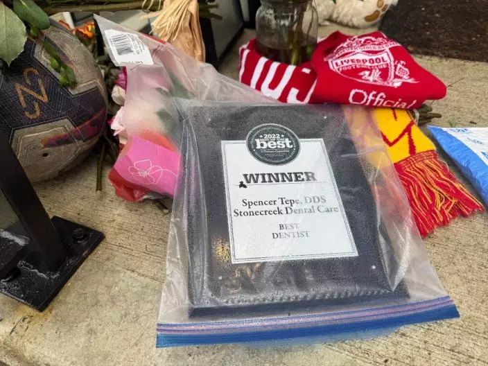 Flowers and other items sit on the front porch of Spencer and Monique Tepe's home in Columbus, Ohio, on Tuesday, Jan. 6, 2026. (AP Photo/Patrick Aftoora-Orsagos)