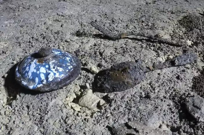 In this photo taken on Friday May 17, 2019, cutlery rusts and an enamel lid lies in a mud in a quarry in Fleury-sur-Orne, near Caen, Normandy. Archeologists are making 3-D models of the network of tunnels that served as a bomb shelter for hundreds of civilians during the battle of Normandy that followed D-Day. (AP PhotoJohn Leicester)