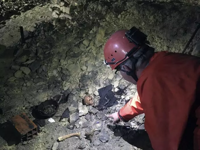 In this photo taken on Friday May 17, 2019 spelunker Laurent Dujardin points to artifacts left by WWII refugees in a quarry in Fleury-sur-Orne, near Caen, Normandy. Archeologists are making 3-D models of the network of tunnels that served as a bomb shelter for hundreds of civilians during the battle of Normandy that followed D-Day. (AP PhotoJohn Leicester)