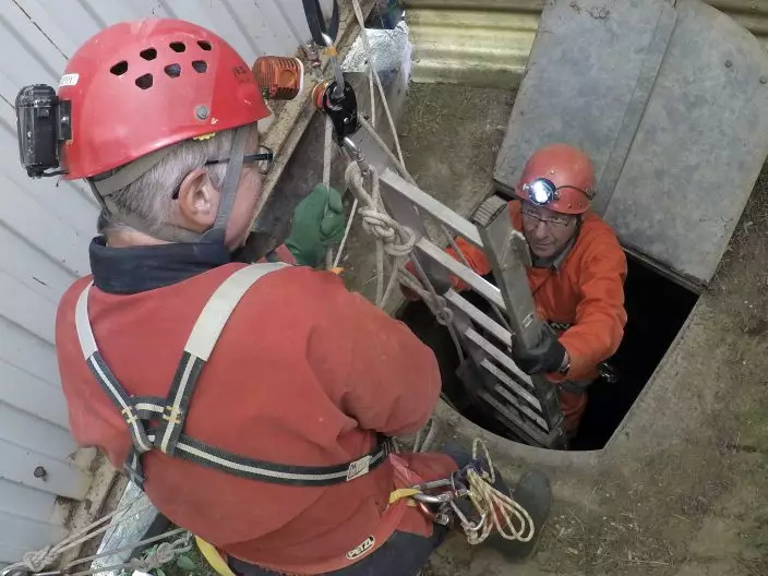 In this photo taken on Friday May 17, 2019, spelunkers rappel down a well shaft into a quarry in Fleury-sur-Orne, near Caen, Normandy. (AP PhotoJohn Leicester)
