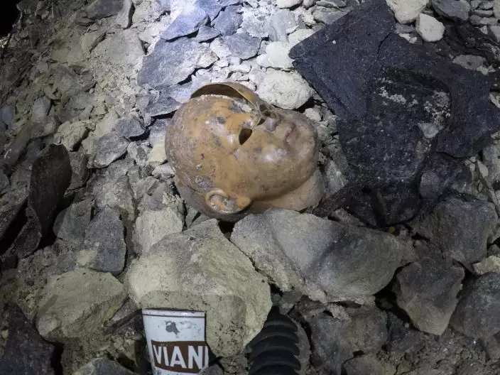 In this photo taken on Friday May 17, 2019, a doll head rests in a quarry in Fleury-sur-Orne, near Caen, Normandy. Archeologists are making 3-D models of the network of tunnels that served as a bomb shelter for hundreds of civilians during the battle of Normandy that followed D-Day (AP PhotoJohn Leicester)