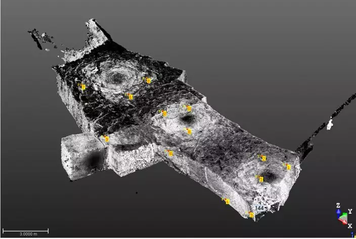 This undated computer image provided by the French National Institute for Preventive Archeological Research (INRAP) shows laser scanners mapping the quarry where refugees found safety in the outskirts of Caen. The extreme precision of laser mapping is allowing programmers to computer-generate 3-D visualizations of the underground space and its abandoned objects, preserving the history. (C. Marcigny Inrap via AP)