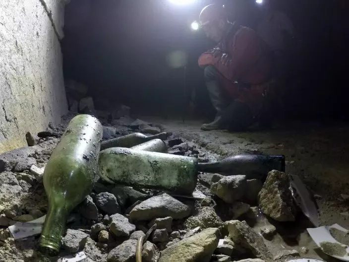 In this photo taken on Friday May 17, 2019 a spelunker inspects empty bottled left by WWII refugees in a quarry in Fleury-sur-Orne, near Caen, Normandy. Archeologists are making 3-D models of the network of tunnels that served as a bomb shelter for hundreds of civilians during the battle of Normandy that followed D-Day (AP PhotoJohn Leicester)