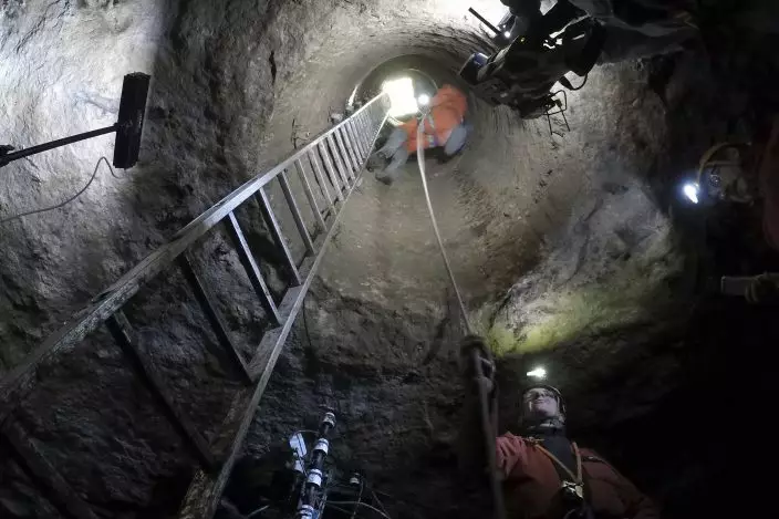 In this photo taken on Friday May 17, 2019 spelunker Philippe Poisson, left, and Laurent Dujardin exit a quarry in Fleury-sur-Orne, near Caen, Normandy. Archeologists are making 3-D models of the network of tunnels that served as a bomb shelter for hundreds of civilians during the battle of Normandy that followed D-Day. (AP PhotoJohn Leicester)