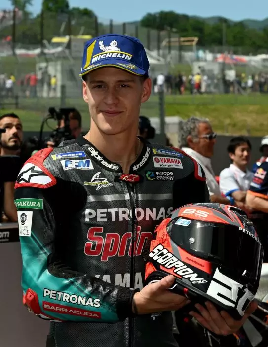 France's Fabio Quartararo poses after setting the second fastest time in the qualifying session for the MotoGP Grand Prix of Italy at the Mugello circuit, in Scarperia, Italy, Saturday, June 1, 2019. (Claudio GiovanniniANSA via AP)