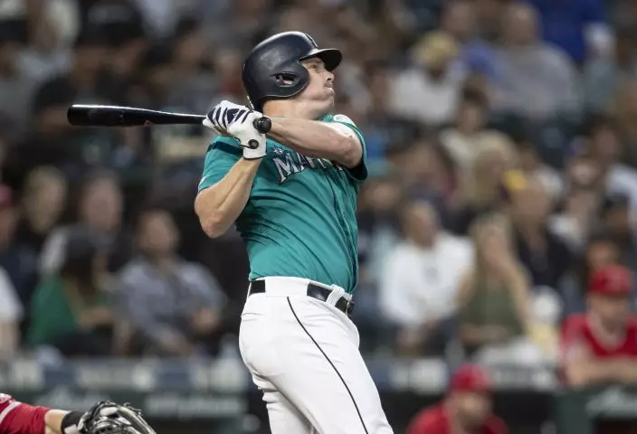 Seattle Mariners' Jay Bruce hits a solo home run off of Los Angeles Angels starting pitcher Tyler Skaggs during the seventh inning of a baseball game Friday, May 31, 2019, in Seattle. The home run was the 300th of Bruce'S career. (AP PhotoStephen Brashear)