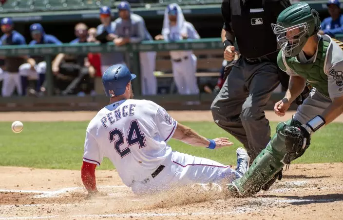 Texas Rangers' Hunter Pence (24) scores on a single by Asdrubal Cabrera off of Oakland Athletics starting pitcher Paul Blackburn as catcher Nick Hundley receives the late throw during the first inning of the first baseball game of a doubleheader Saturday, June 8, 2019, in Arlington, Texas. Elvis Andrus also scored on the play. (AP PhotoJeffrey McWhorter)