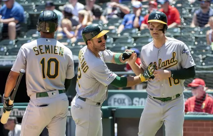 Oakland Athletics' Ramon Laureano, center, and Chad Pinder, right, celebrate after scoring on a pinch hit double by Josh Phegley as Marcus Semien (10) looks on during the fourth inning of the first baseball game of a doubleheader against the Texas Rangers, Saturday, June 8, 2019, in Arlington, Texas. (AP PhotoJeffrey McWhorter)