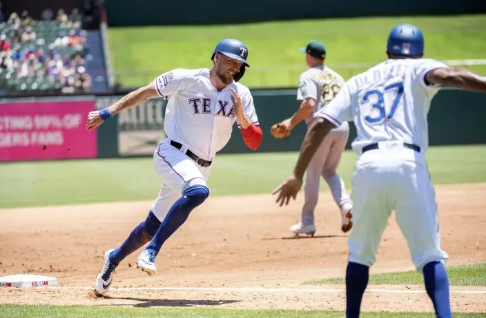 Texas Rangers' Hunter Pence is waved home by third base coach Tony Beasley (37) on his way to scoring on a single by Asdrubal Cabrera off of Oakland Athletics starting pitcher Paul Blackburn during the first inning of the first baseball game of a doubleheader Saturday, June 8, 2019, in Arlington, Texas. Elvis Andrus also scored on the play. (AP PhotoJeffrey McWhorter)
