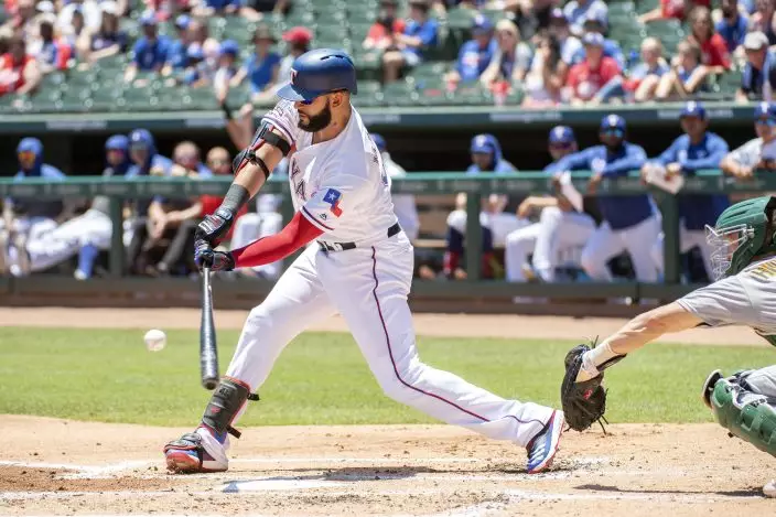 Texas Rangers' Nomar Mazara connects on a sacrifice fly off of Oakland Athletics starting pitcher Paul Blackburn that scored Shin-Soo Choo during the first inning of the first baseball game of a doubleheader Saturday, June 8, 2019, in Arlington, Texas. (AP PhotoJeffrey McWhorter)
