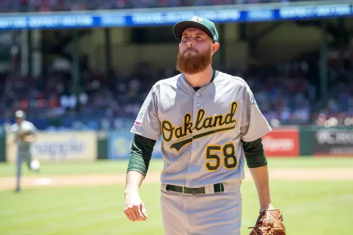 Oakland Athletics starting pitcher Paul Blackburn (58) walks off the field after giving up 3 runs against the Texas Rangers in the first inning of the first baseball game of a doubleheader Saturday, June 8, 2019, in Arlington, Texas. (AP PhotoJeffrey McWhorter)