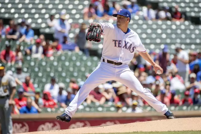 Texas Rangers starting pitcher Joe Palumbo, making his major league debut, works against the Oakland Athletics during the first inning of the first baseball game of a doubleheader Saturday, June 8, 2019, in Arlington, Texas. (AP PhotoJeffrey McWhorter)